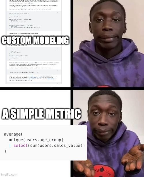 Just to be clear, while AQL presents a new approach to handling complex metric composition, we're not suggesting it should replace SQL. SQL is the lingua franca of data analysis. It's still going to play a key role in the field whether we want it or not. Transforming and cleaning data is still best done with SQL or other languages that compete in that space (PRQL, Kusto, etc).