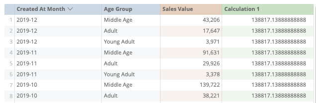 Checking the SQL it’s apparent that this doesn’t work because we’re joining only on Age Group and the aggregation grouping inside the view doesn’t have grouping on Created At Month. Thus, the average will always equal the average of all time.