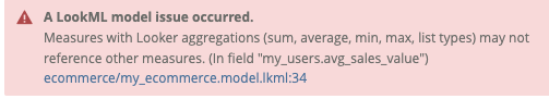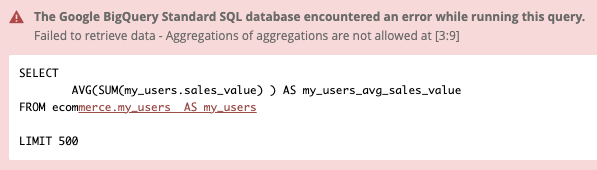 First, the grouping by Age Group is nowhere to be found (we did not know where to put it in the LookML anyway) and second it’s just not possible to put nested aggregation inside another aggregation in SQL.