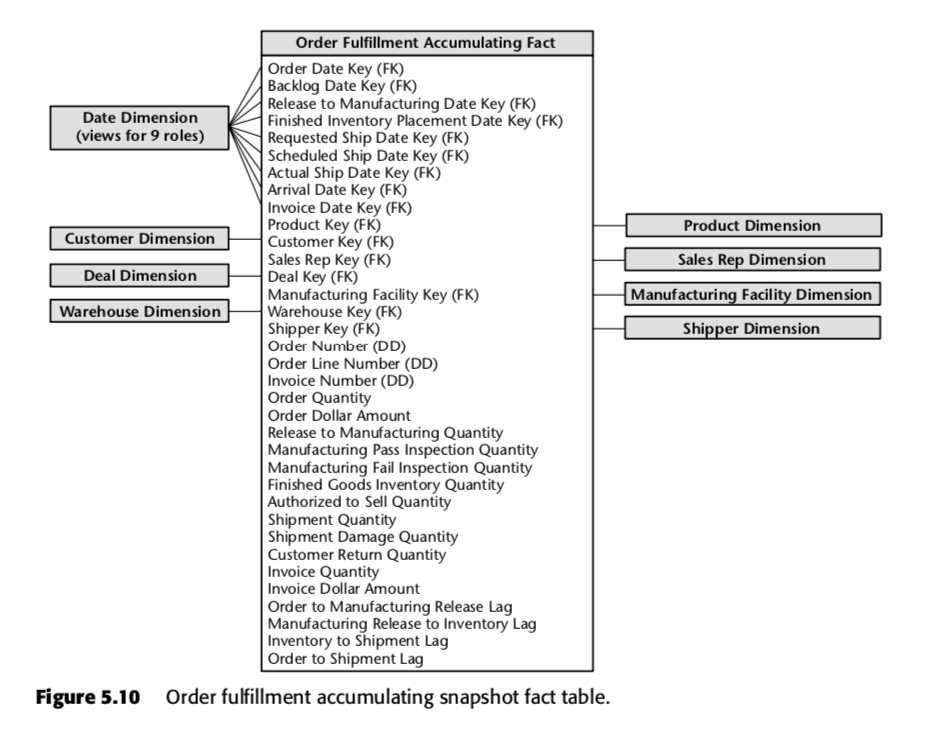 The accumulating snapshot fact table is thus a method to measure velocity within the business process. Take, for instance, this business pipeline, which Kimball presented in the second edition of The Data Warehouse Toolkit: