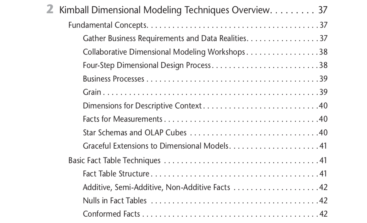 Kimball and Ross noticed this and finally gave in: in their third edition, published in 2013, they added a new chapter (Chapter 2, “Kimball Dimensional Modeling Techniques Overview”), which served as an index for all the ideas that were spread all throughout the text. This chapter is why you should read the third edition, and the third edition only. Use Chapter 2 as a guide to the rest of the book. Jump around to familiarise yourself with Kimball’s techniques. And only read a chapter from beginning to end if it is a business domain you care about.