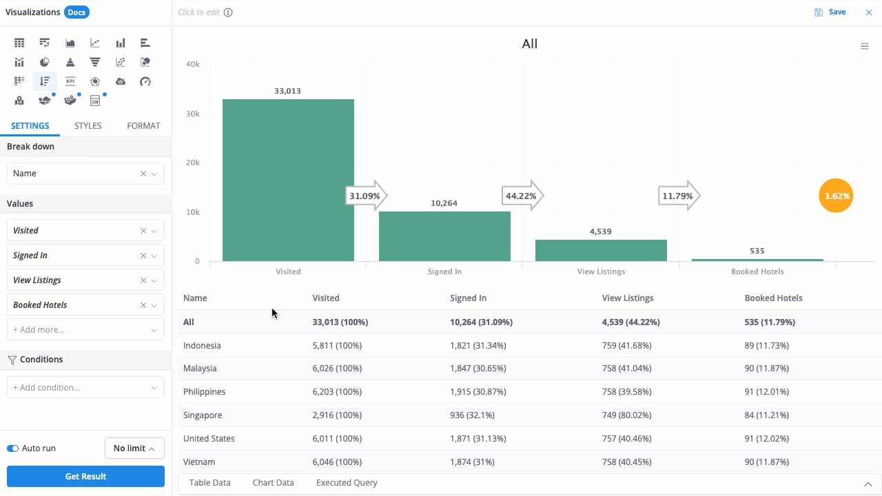 → Drag Country Name to Breakdown, and the values Visited, Signed In, Viewed Listings, and Booked Hotel to Values. Drag Name to Conditions