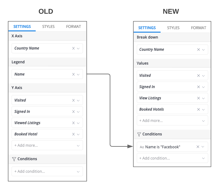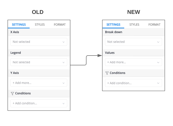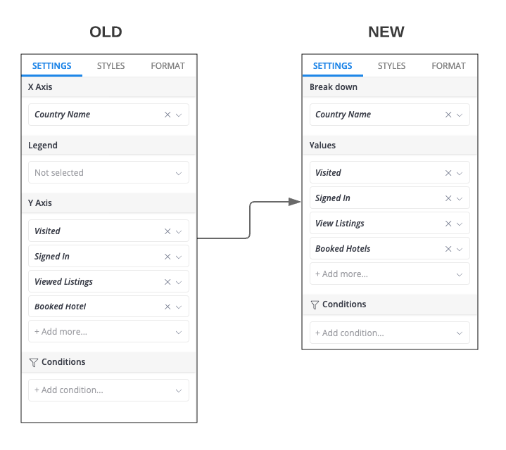 If you explore or edit a report that's not a conversion funnel, or create a new report from scratch, we will display the new UI and logic of the conversion funnel. (Breakdown instead of X-axis and Legend, Values instead of Y-axis). Then you will be able to create a conversion funnel using the new logic.