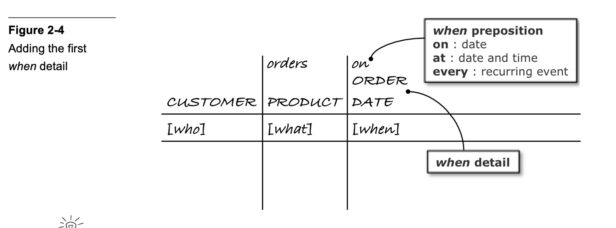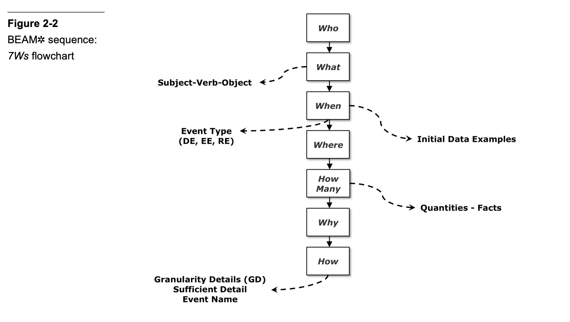 The authors recommend you go through the flow in roughly the prescribed order. For each question in the 7W process, you will unearth some detail that tells you how your eventual data model should look like. Running through the 7Ws looks like this:
