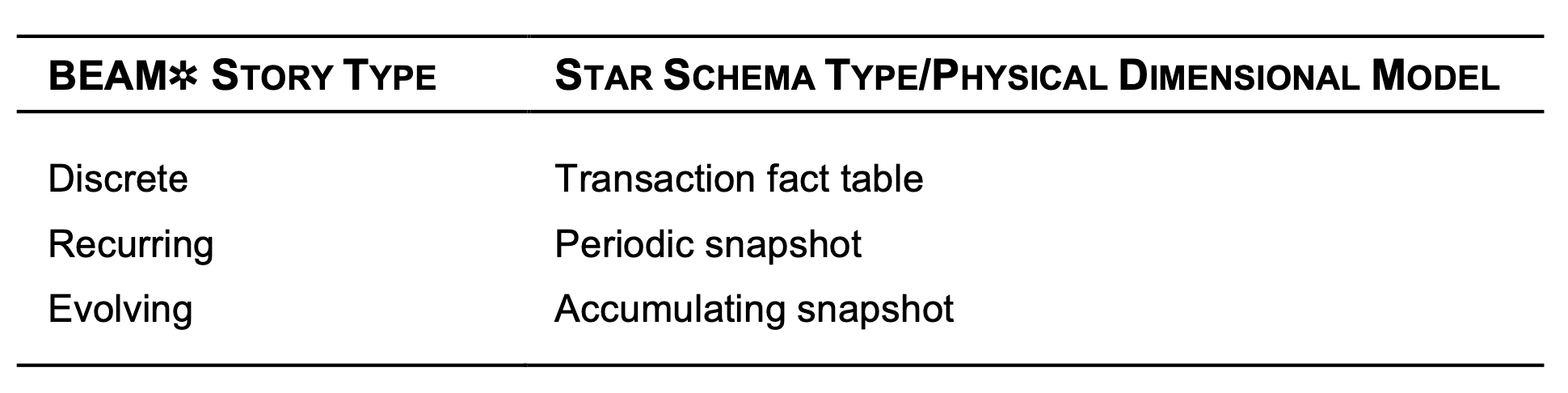So by the 3rd W, you’ve already figured out your fact table type. You put this down in your BEAM✲ table like so: