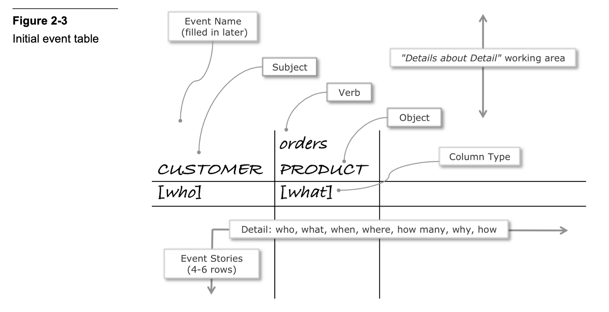 3) The next step in the 7Ws process is to fill the BEAM✲ table with event stories — that is, made-up examples of the business event that is currently being explored. These event stories are a way of eliciting all the remaining W questions (where, how many, why, how) in order to clarify each event detail as you discover them. They are also useful for identifying edge cases and wonky details (like: what if there isn’t a product name because it’s been deleted?)