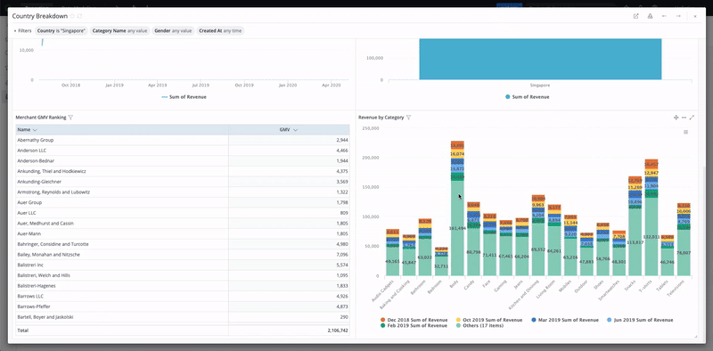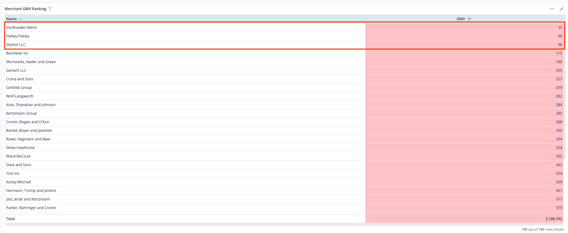 To identify merchants with the lowest GMV, simply use Sort. You can also leverage Conditional Formatting to change the cell's color based on the revenue. That way it's much easier to detect weak perfromers.