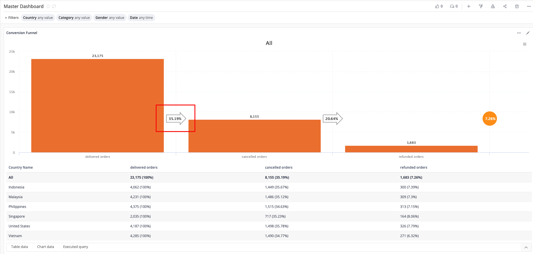 Holistics is extremely helpful when it comes to visualizing eCommerce metrics, especially conversion rates. Using Holistics, you can easily graph out your conversion funnel using the Funnel visual type.