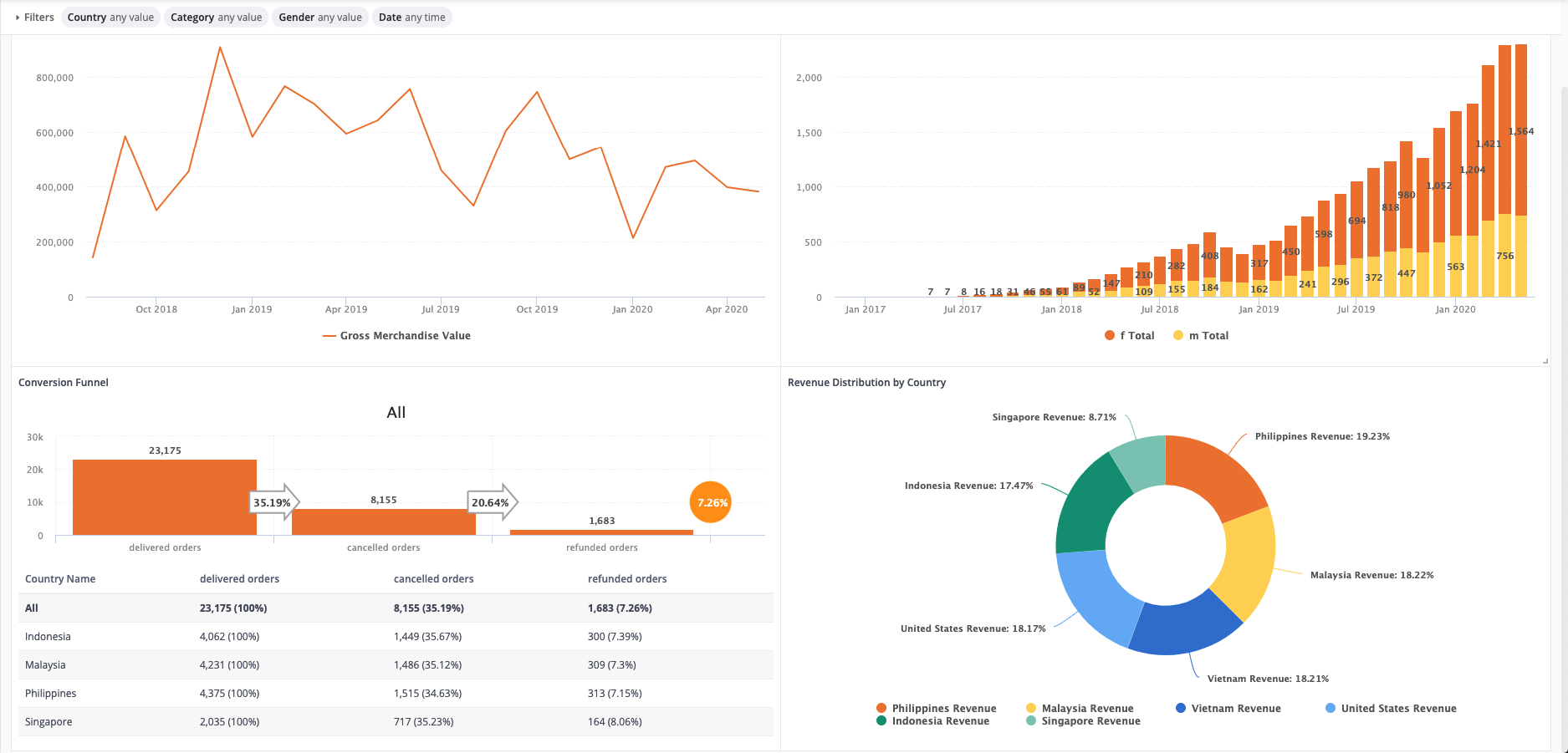 In our example, we notice a huge amount of orders are canceled orders (35%) - which means a ton of money was wasted on logistics, human management, and business operation.