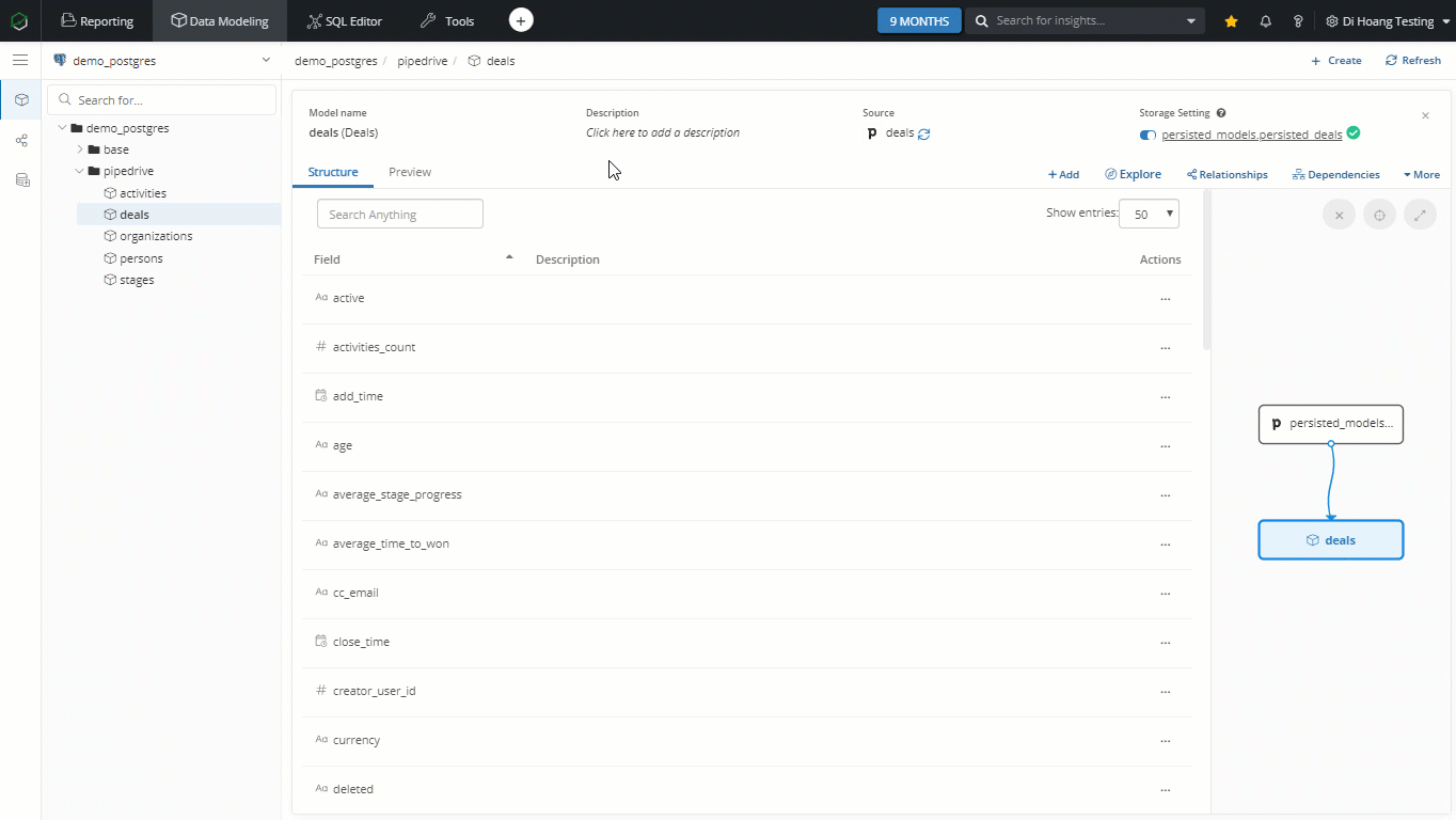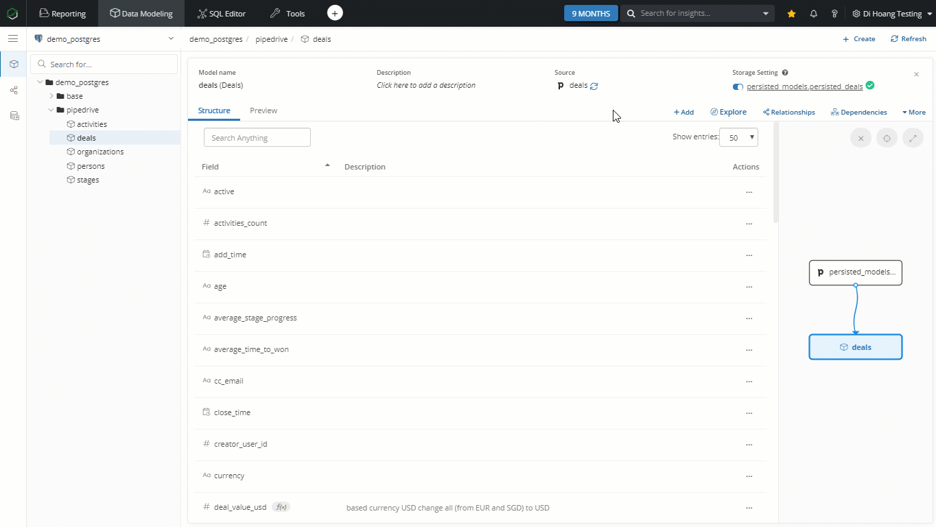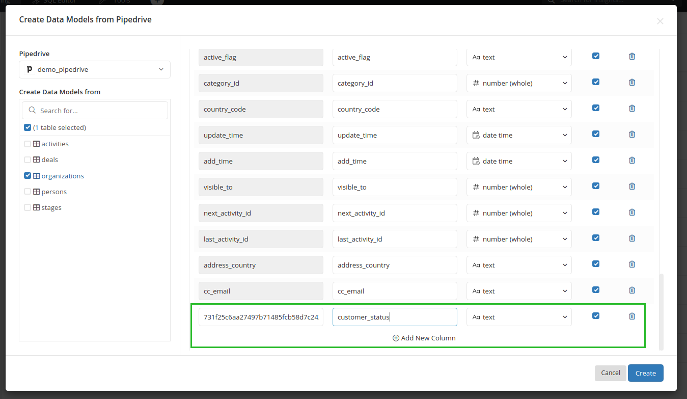 By default, Holistics will load in the default fields of your Pipedrive tables and map them to a proper data type. If your table has a custom field, you have to manually add it using the field key that Pipedrive provided.