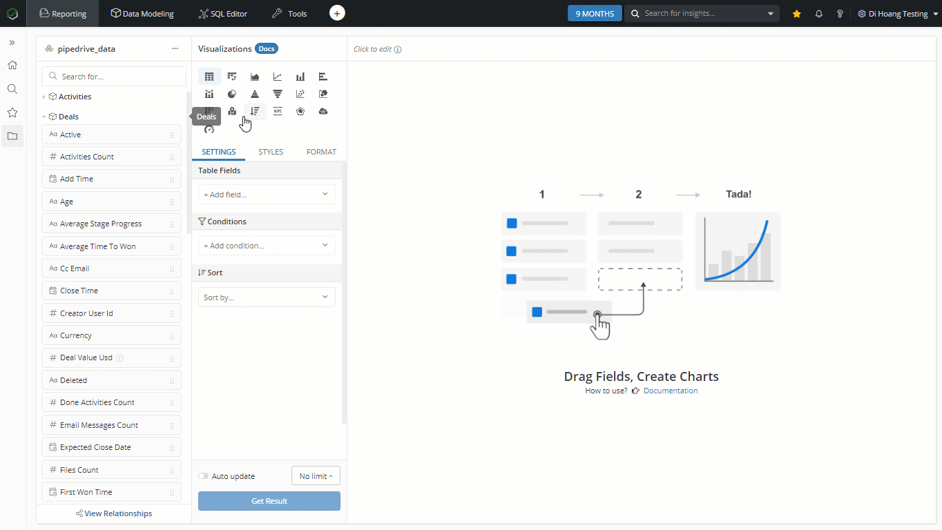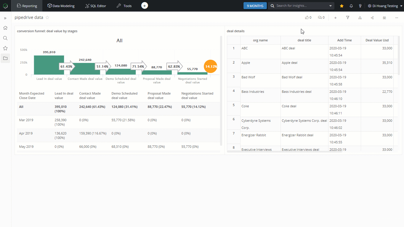 In this example, I will create a conversion funnel to see deal values through different stages. With just a few clicks and vòila, you got an insightful chart.