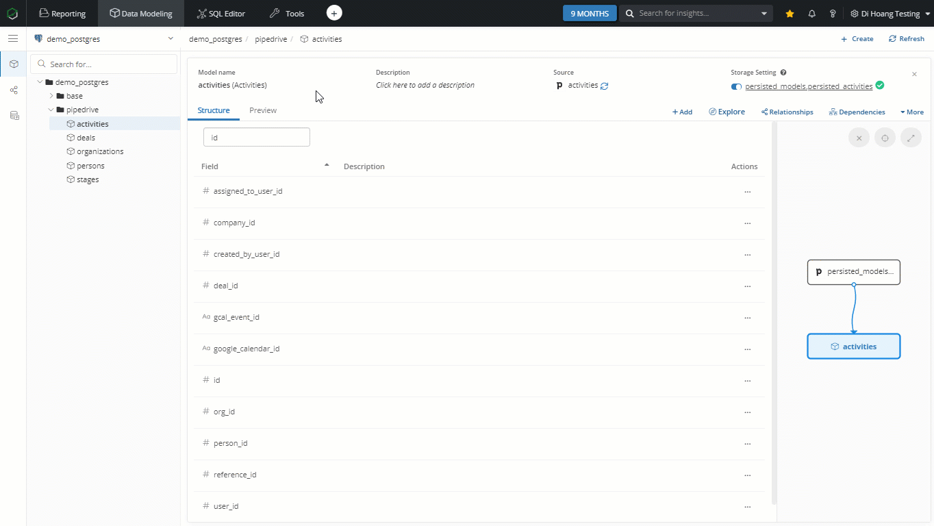 For example, there could be a lot of activities around a particular deal so I will link activities data model to deals data model with a many-to-one relationship (n-1) on activities.deal_id and deals.id.