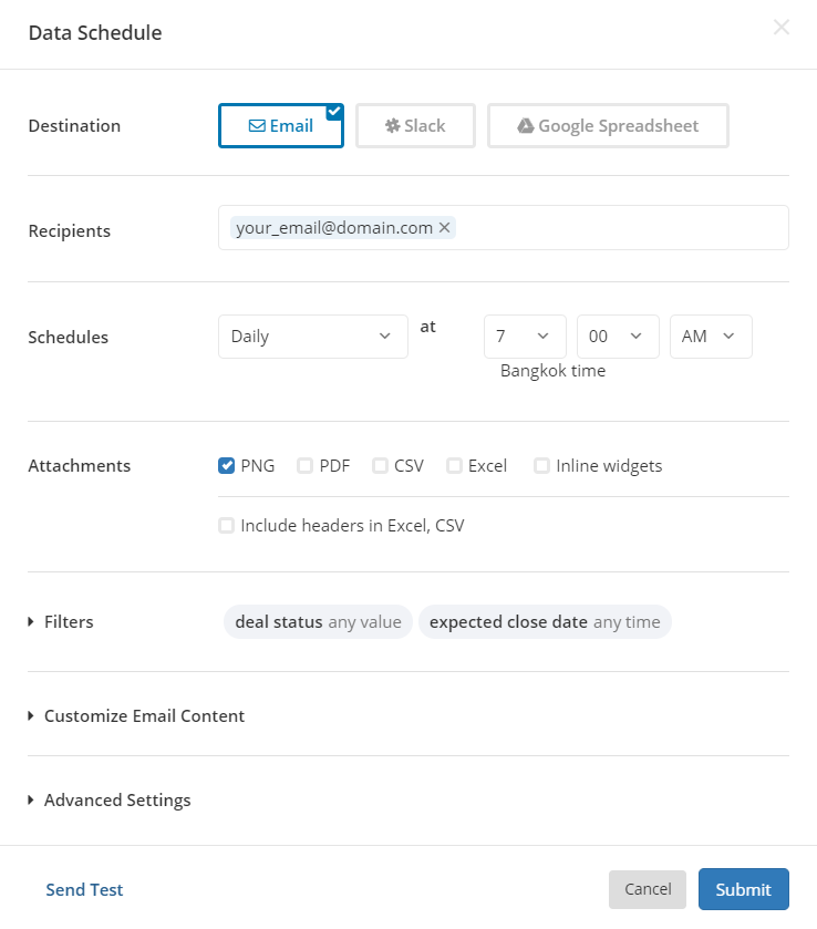 Finally, schedule your fresh dashboards to your mailboxes or Slack everyday, so everyone can keep in touch with latest data change and conveniently use data in internal discussions.