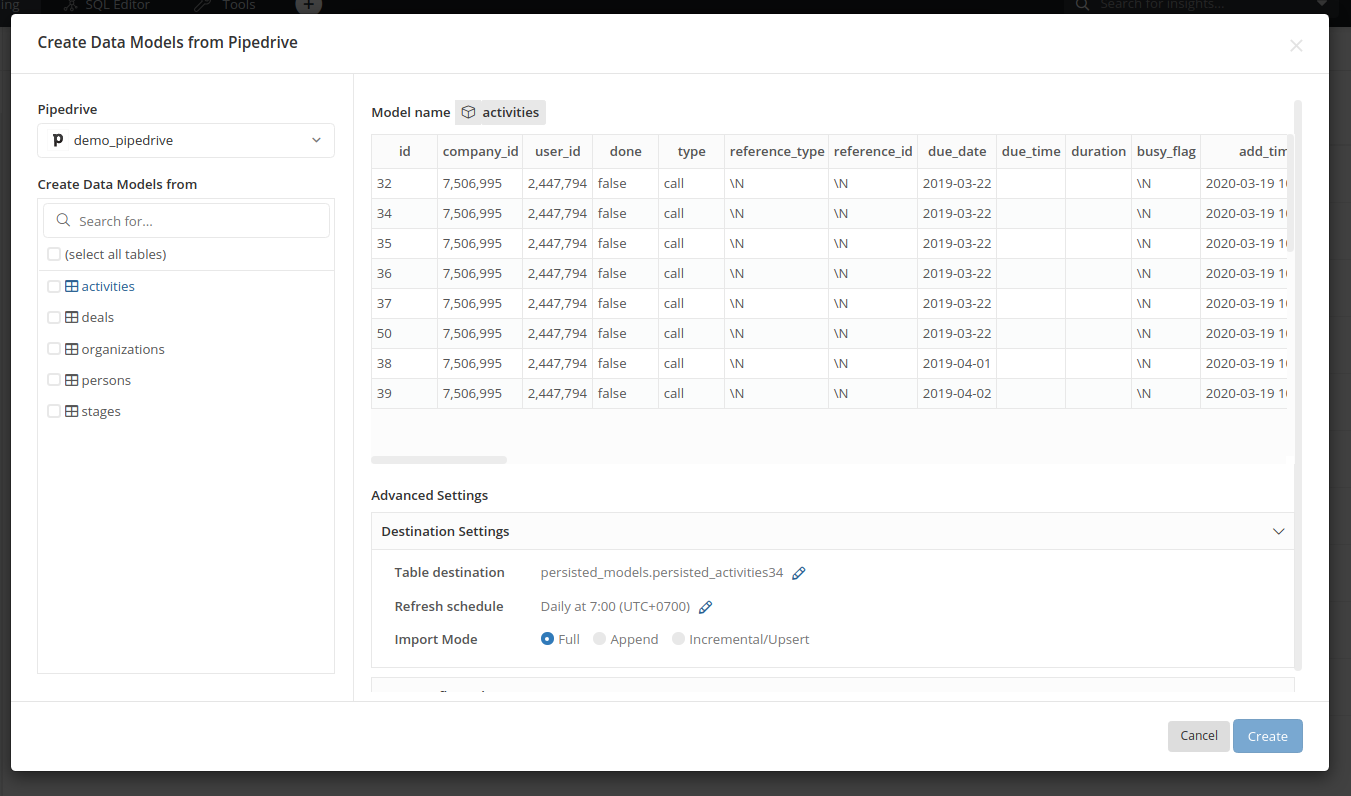 After that, you can select which Pipedrive table to be imported to your Data Warehouse. In the example, I selected all five tables (activities, deals, organizations, persons and stages) for modeling.