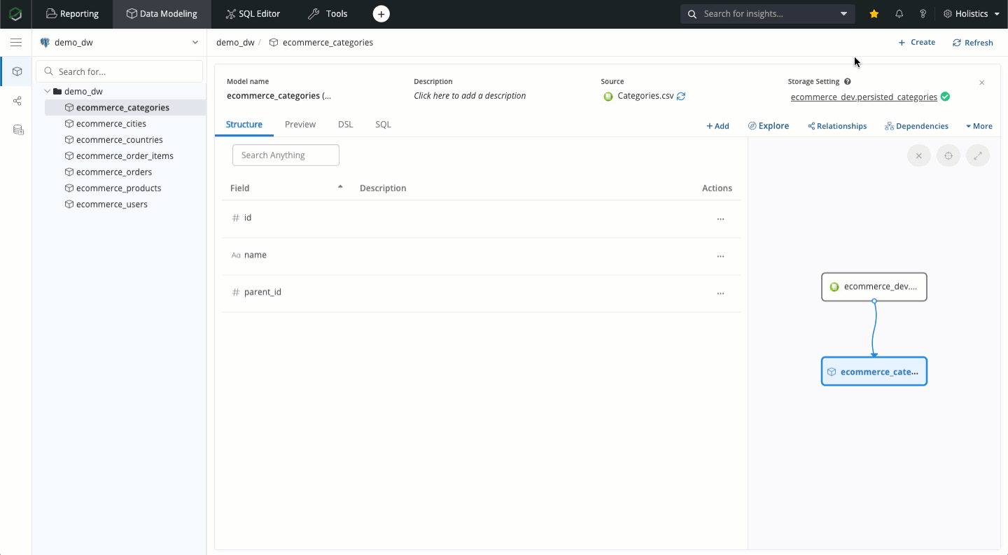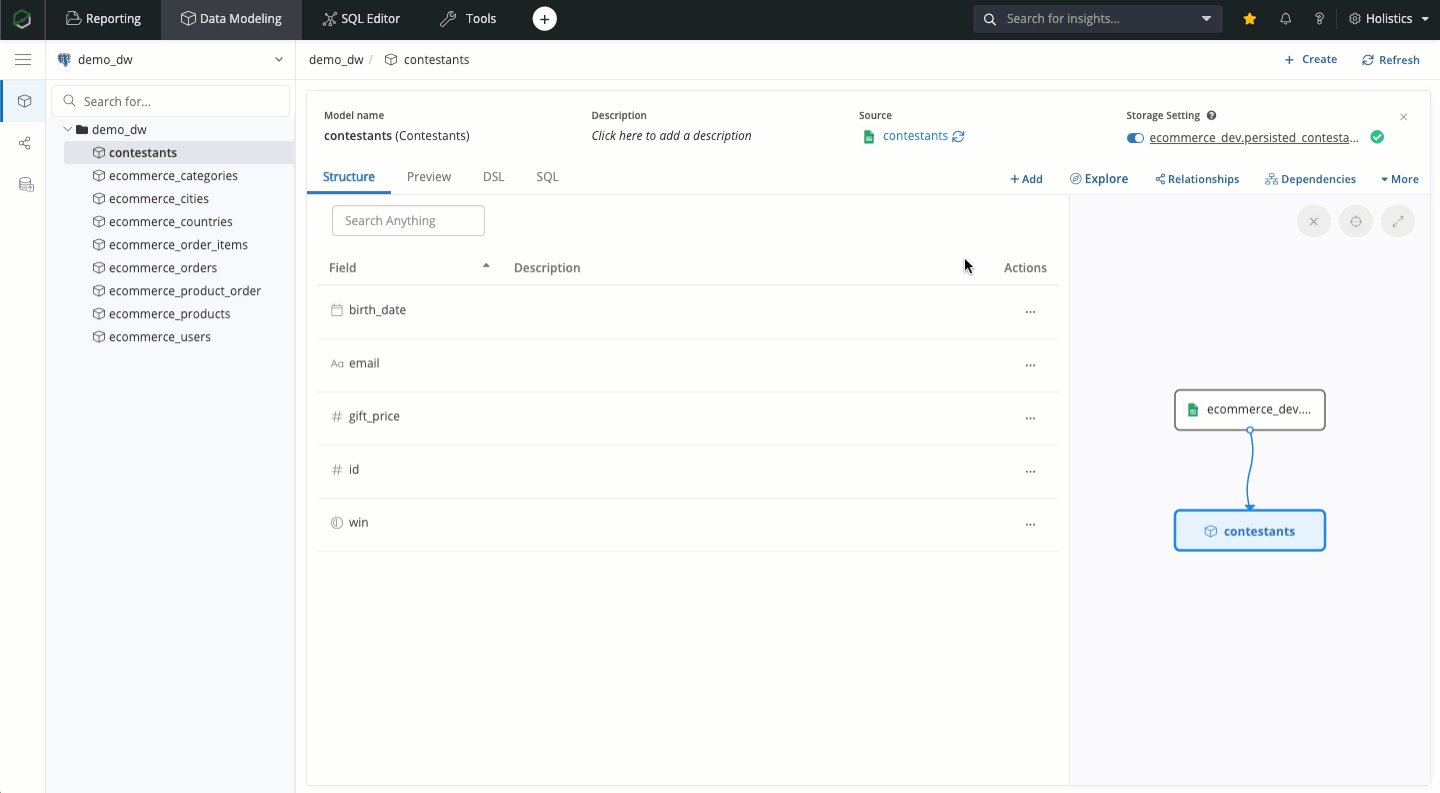 After successfully creating data models from these sources, you can open a Data Model to see its structure or preview actual data sitting in your data warehouse.