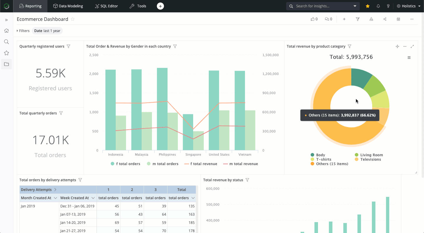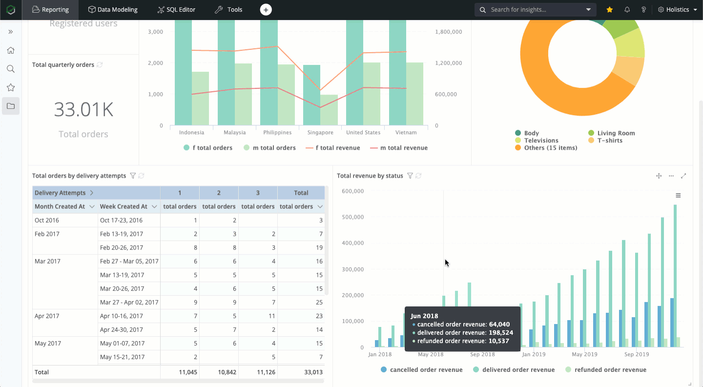 Holistics is a BI platform that helps you set up and run you data analytics stack. It supports you to consolidate multiple data sources, model your data and generate meaningful insights. It's also free, so you can register and start building your dashboards following this guide.