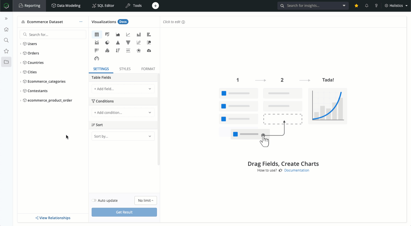 After successfully creating a dataset, you can easily explore your data just by dragging in fields, measures, applying conditions, and tweaking the visualizations.