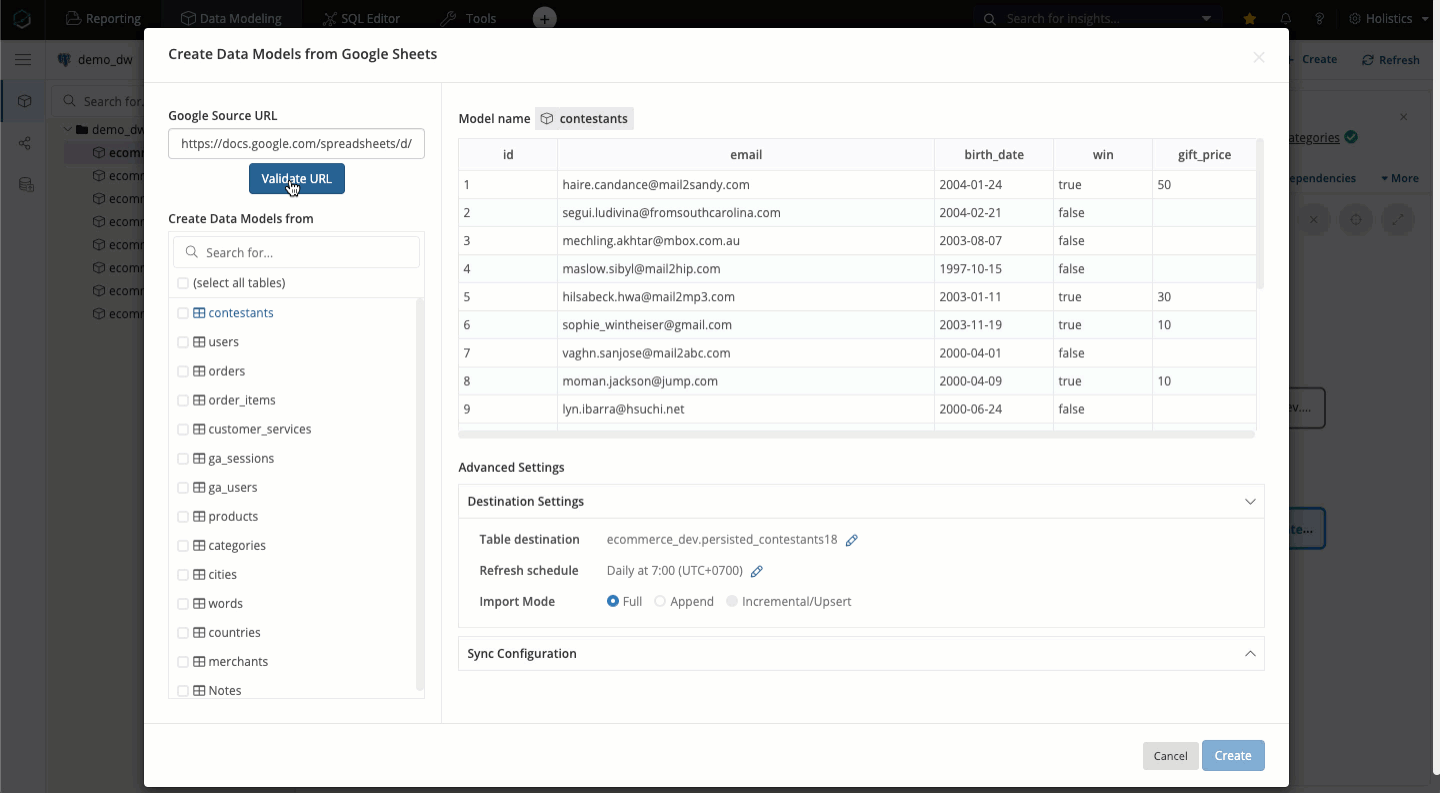 After selecting Google Spreadsheet icon, paste the URL of your Google Spreadsheet into the box, then click Validate to preview your data. If this is the first time you connect to a spreadsheet, you will be prompted to grant Holistics permission to connect to your Google Account.