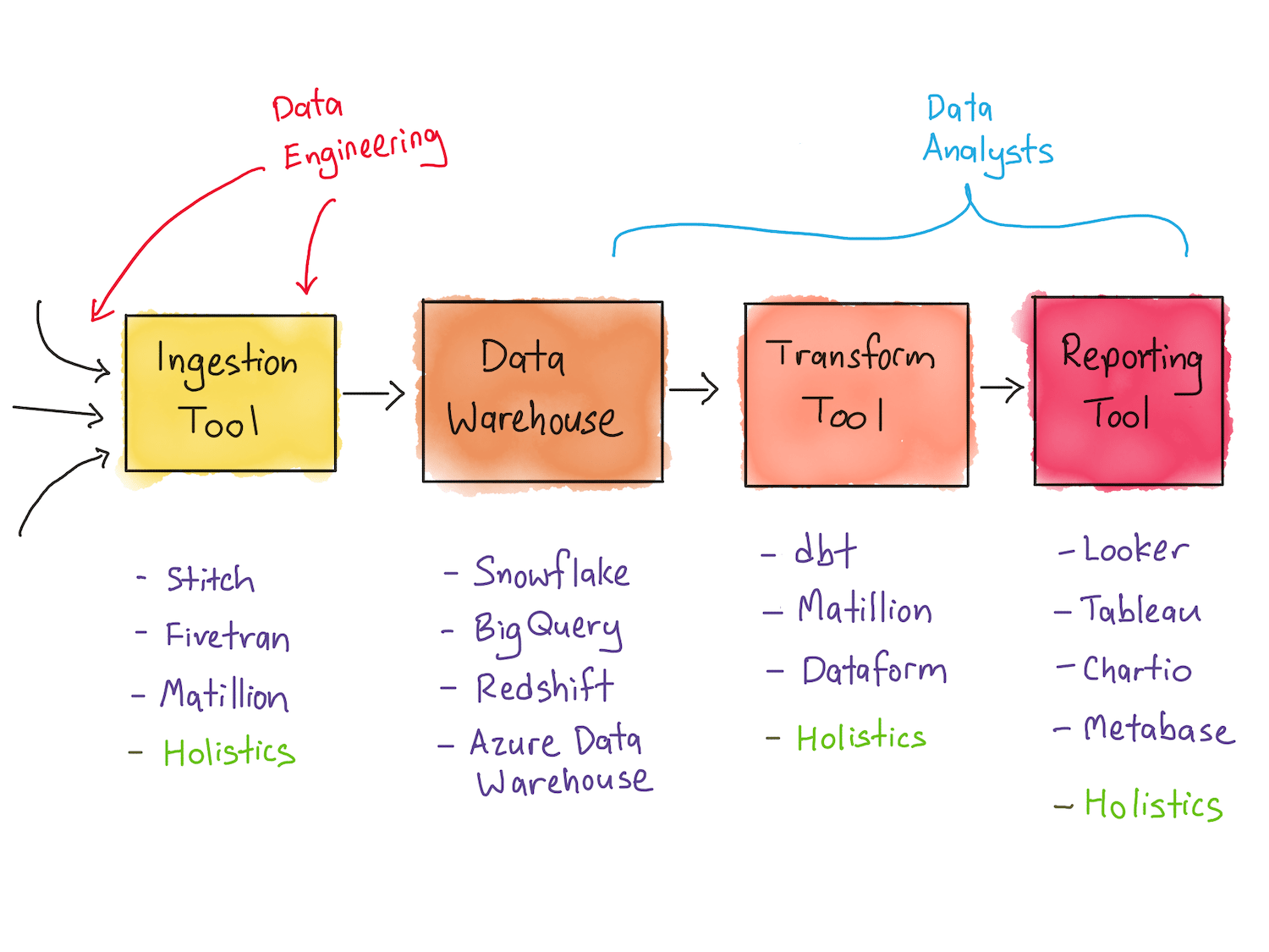 To generalise a bit, these perspectives are heavily weighted towards tools that empower data analysts. Notice that the majority of tools enable analysts with basic SQL knowledge to perform and manage transformations within the data warehouse … roles that traditionally have been the domain of the data engineer. The implication here is that such teams prefer to reduce the amount of data engineering needed to deliver business intelligence to the company. Such stacks look something like this: