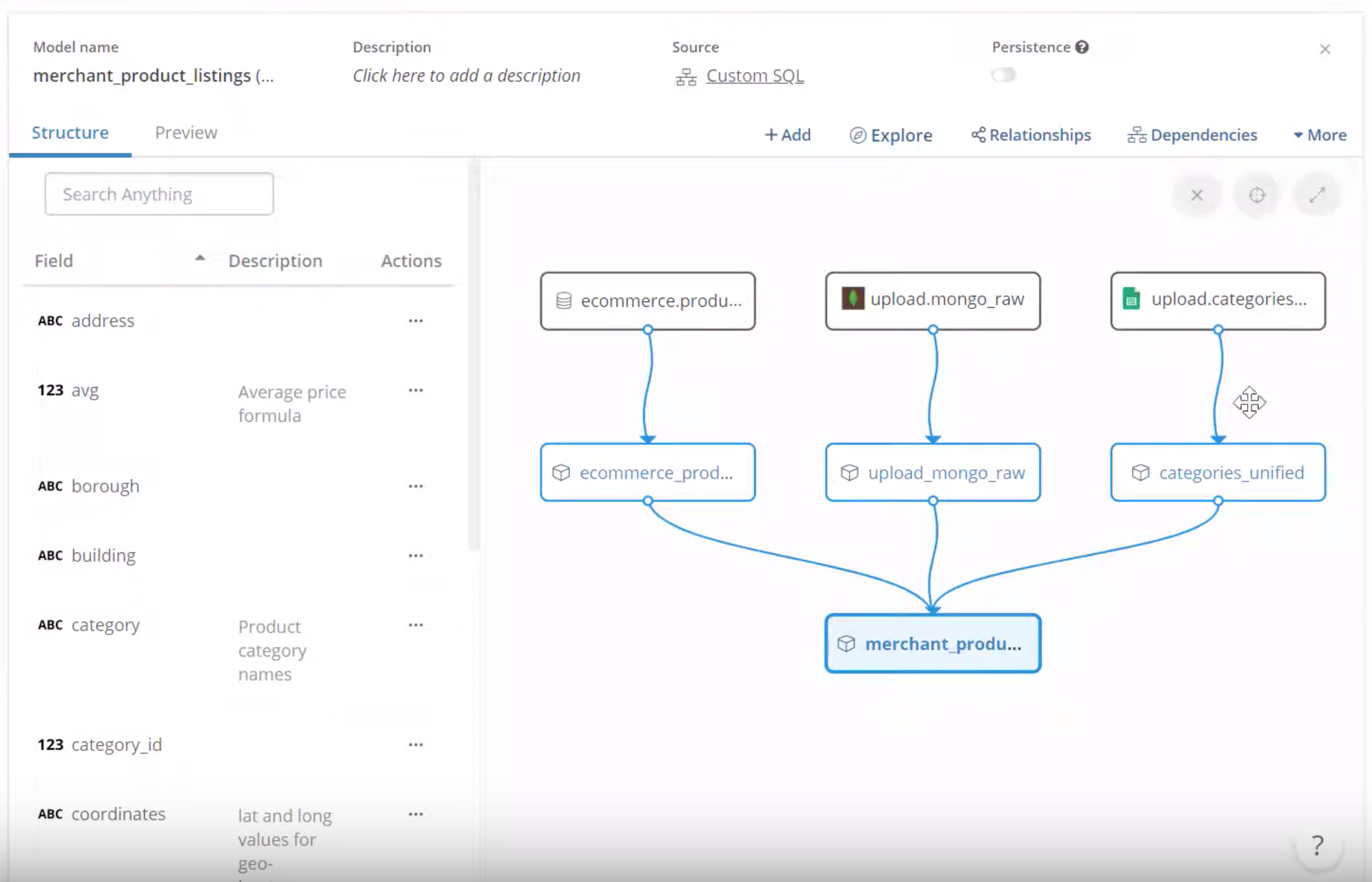 This allows you to skip the tedious work of creating a new pipeline and testing the data and writing code to combine everything — you know, the boring plumbing work that usually happens in order to do such things. In Holistics, you create a data model from your external sources once ... and then reuse this model whenever you need information about your merchants's product listings!