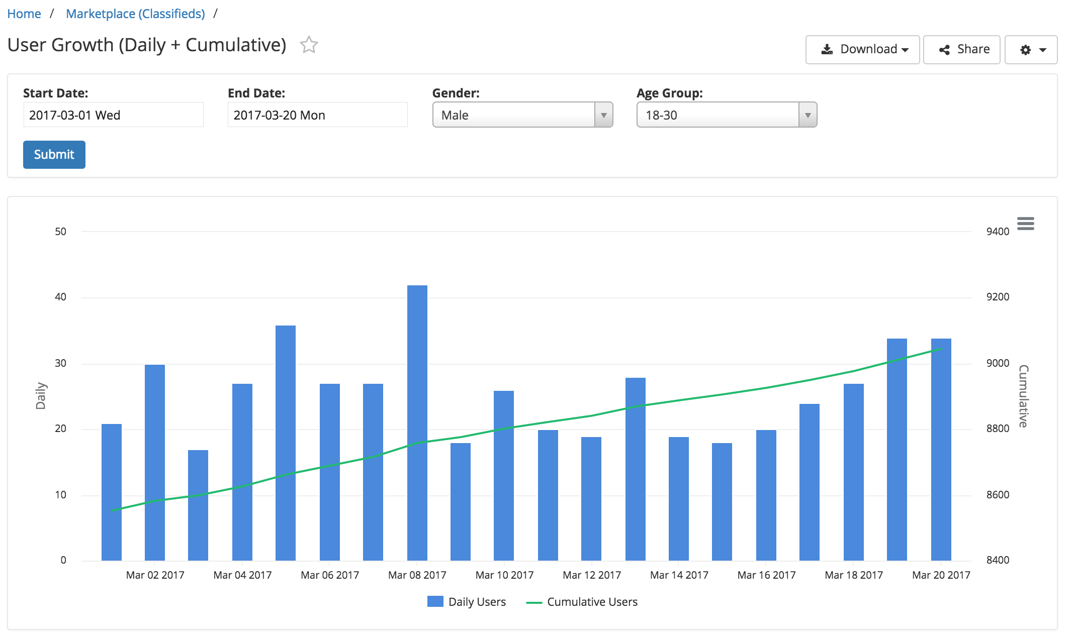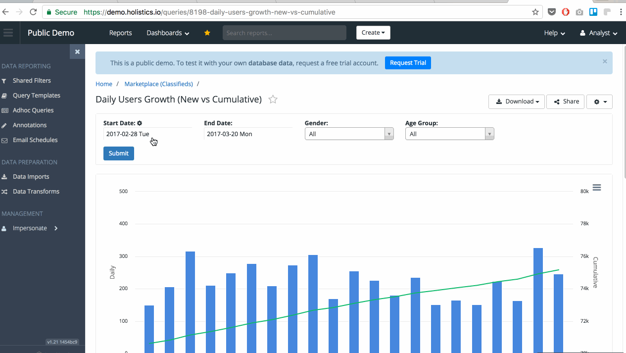 In this article I will show you how to build daily user growth report with cumulative number (running total) using mostly SQL, and filter capabilities of Holistics platform.