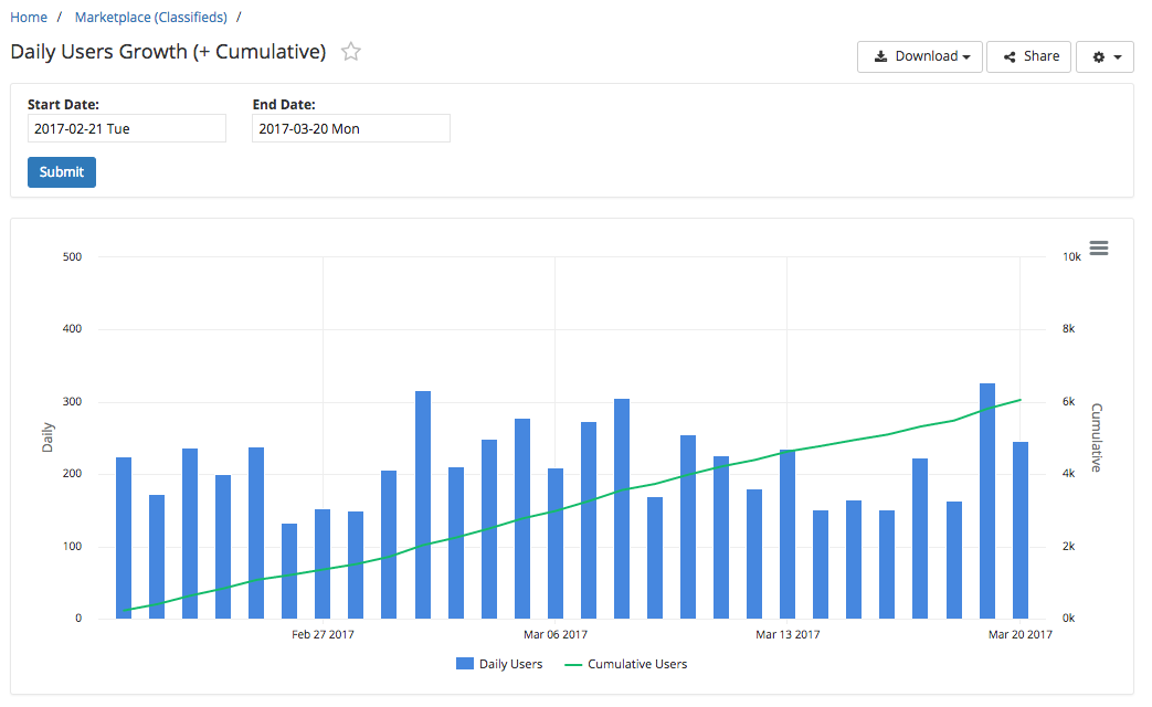 Another thing looked wrong in the above image: the accumulating sums only sum for the selected date period, instead of taking into account the total user signups from the beginning of time.
