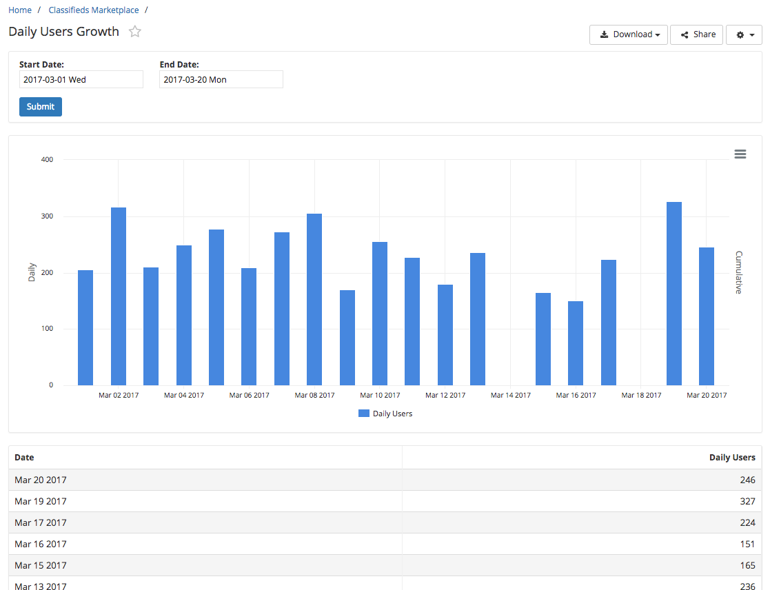 Let's start by building a simple daily count report with visualization like below. Report viewers have ability to select a date period to see only data for that range.