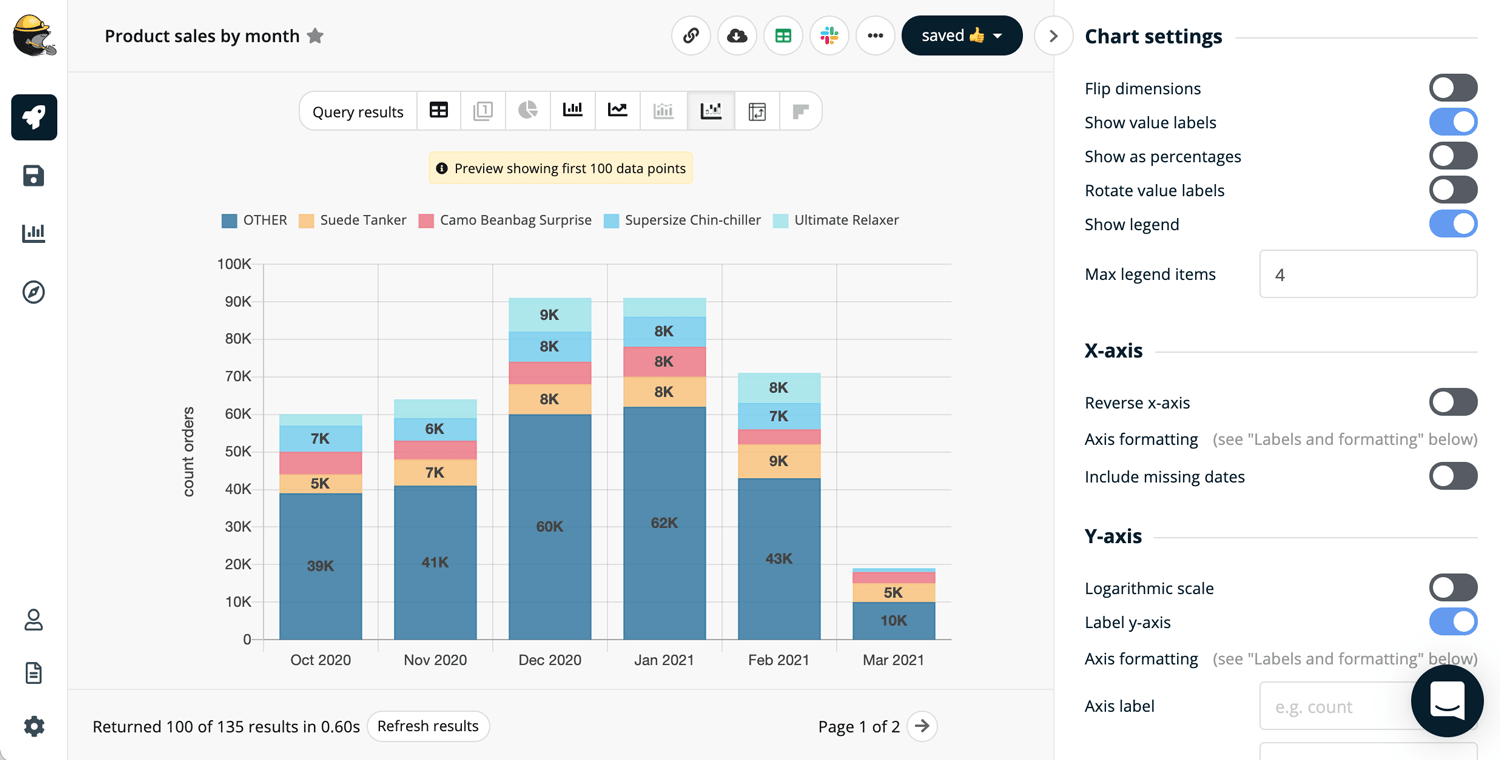 Metabase is an open-source SQL BI tool. It’s easy to use but limited in self-service functionalities. One of its notable features is the Question Feature, which lets you answer your ad-hoc data questions. In “Simple question” mode, you can filter, summarize, and visualize data.