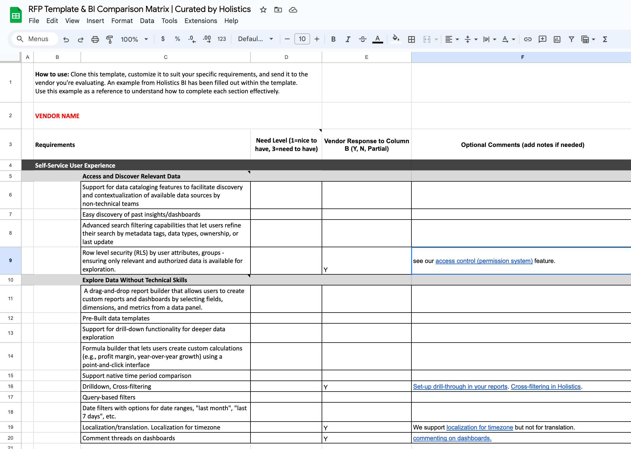 Since everyone's criteria are different, we recommend cloning this template and customizing it to fit your specific needs before sending it to the vendor you’re evaluating.