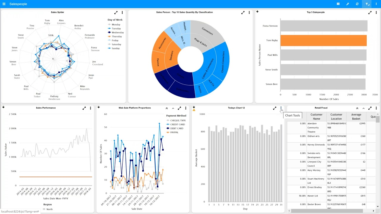 Non-technical users can analyze and build their own charts using a drag-and-drop report builder, built-in interactive controls (e.g,, date-drills, drill throughs, filtering), 1-click analytical functions (e.g, Period comparison, percent total, trend analysis), or query data using plain English with an AI interface.