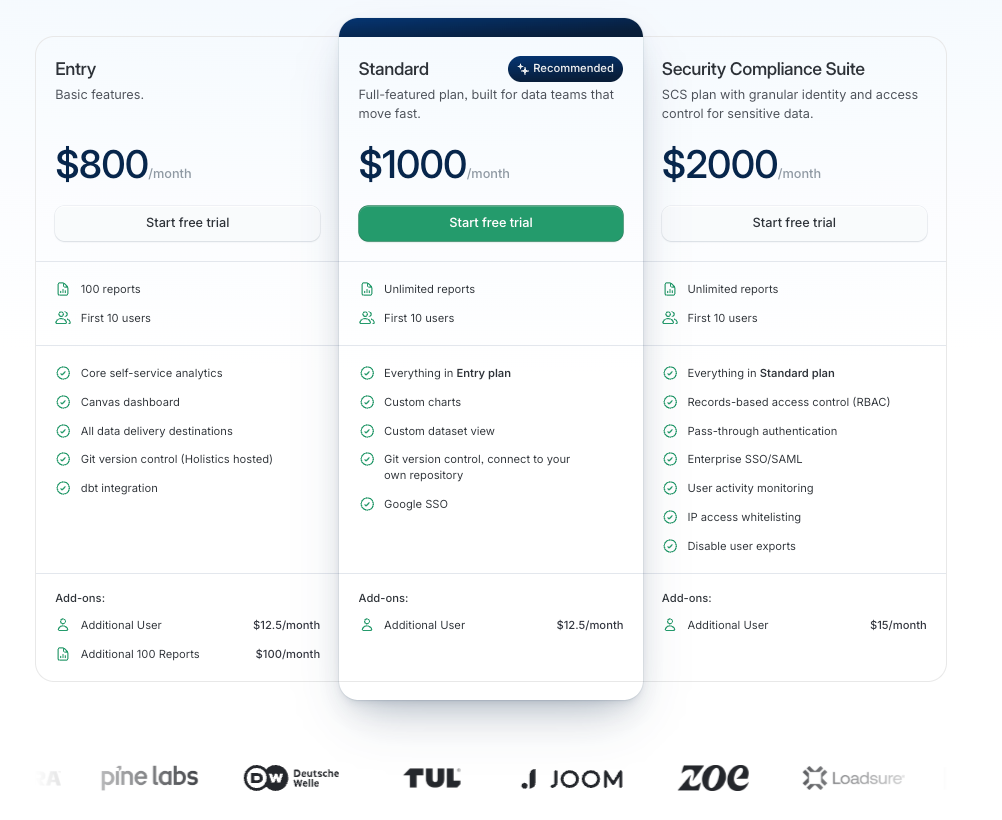 Pricing: Starts at $800/month. Most popular plan is Standard Plan offering core self-service analytics features, and Git version control.