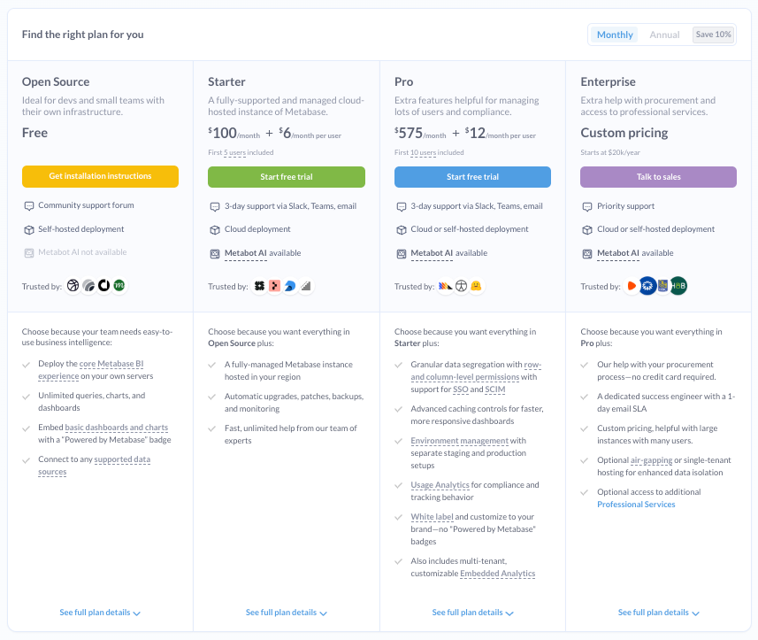 - Open-source flexibility: As an open-source tool, Metabase offers significant flexibility for customization and integration, tailored to your organization’s specific needs.