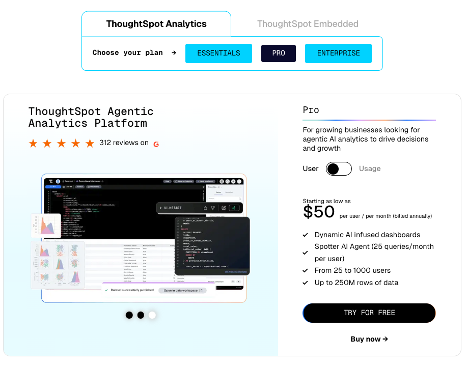 Thoughtspot Pricing starts at $25 per user / per month for Essential Plan.
