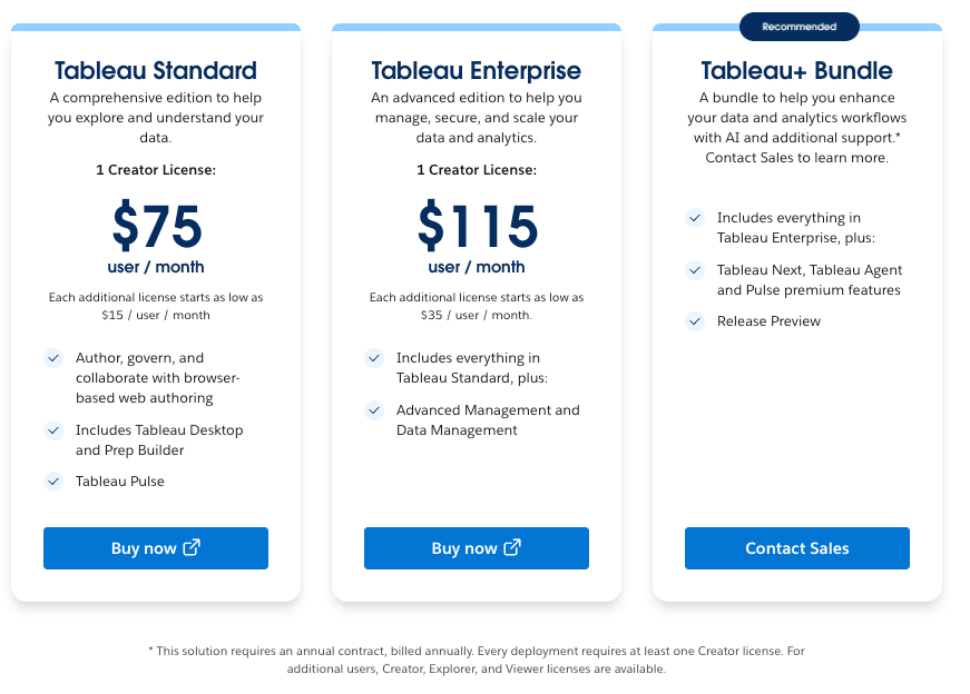 Tableau pricing starts at $75 per user/month for a Creator license. In a self-service setup, if most (or all) users need Creator access, costs can balloon quickly as you scale.