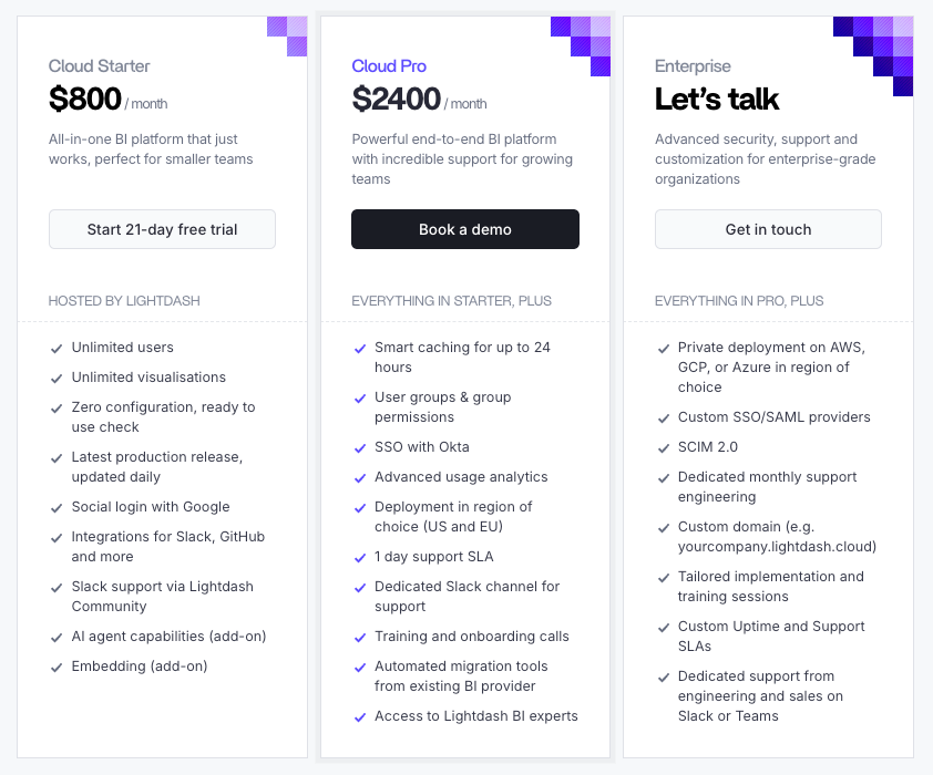 Lightdash pricing starts at $800/month.