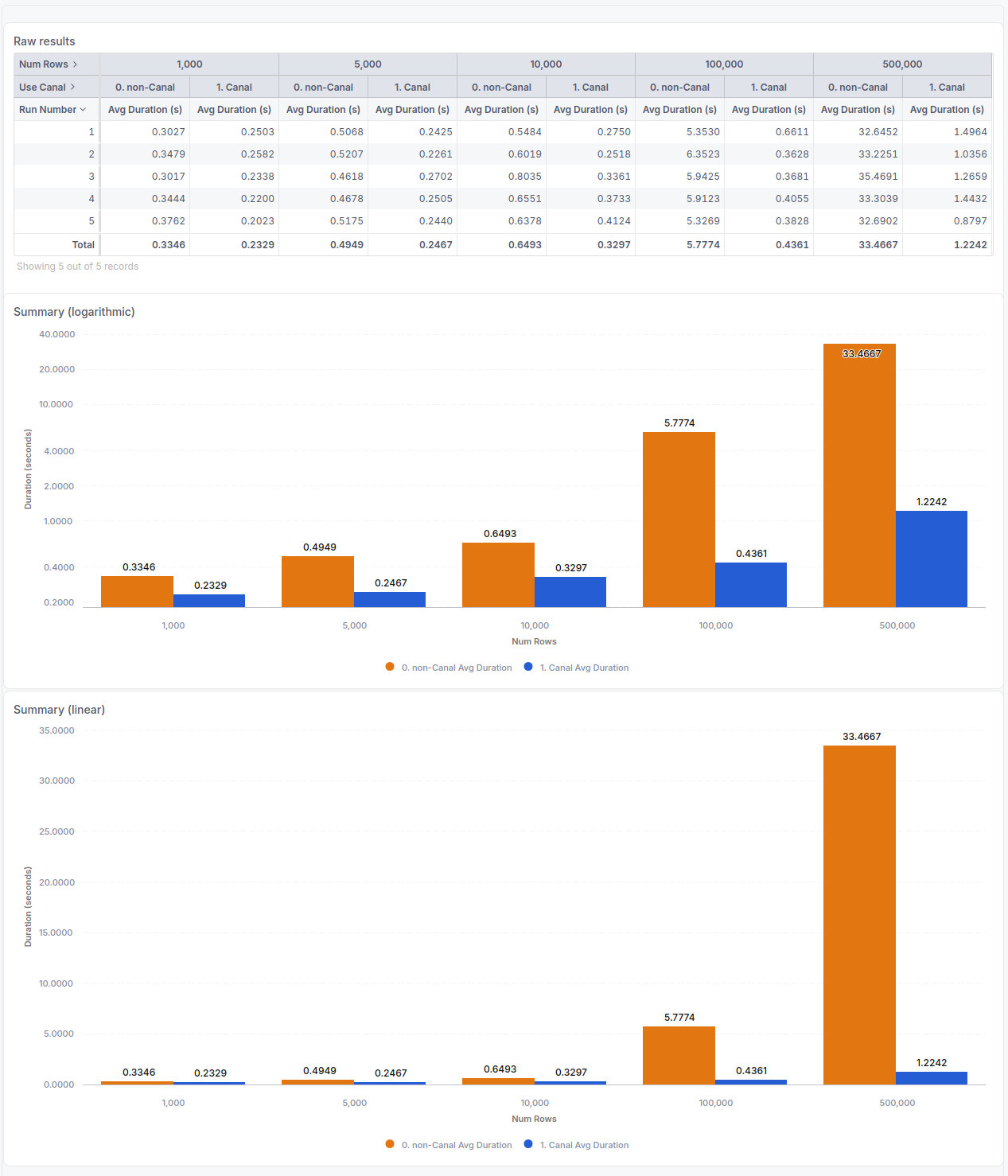 Realistically speaking, we think Canal achieve somewhere from 2x-3x performance improvements on average use cases. In some internal test cases, Canal has achieved over 5x performance improvements from our existing system on queries ranging from 100,000 to 500,000 rows in result sets. Check out the demo below.