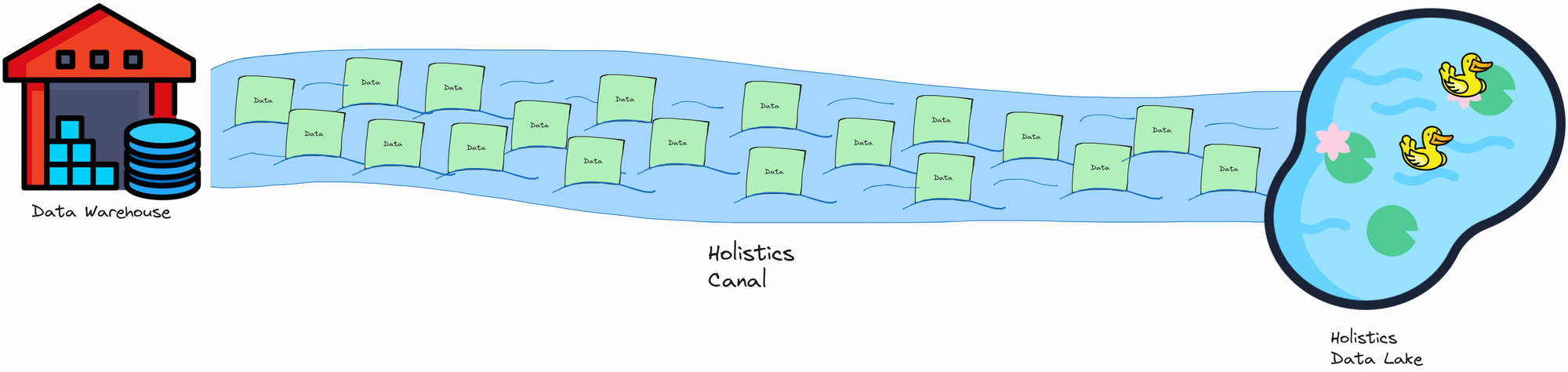 - Data “flows” as smaller “packages” or chunks through the Canal straight into the Data Lake.