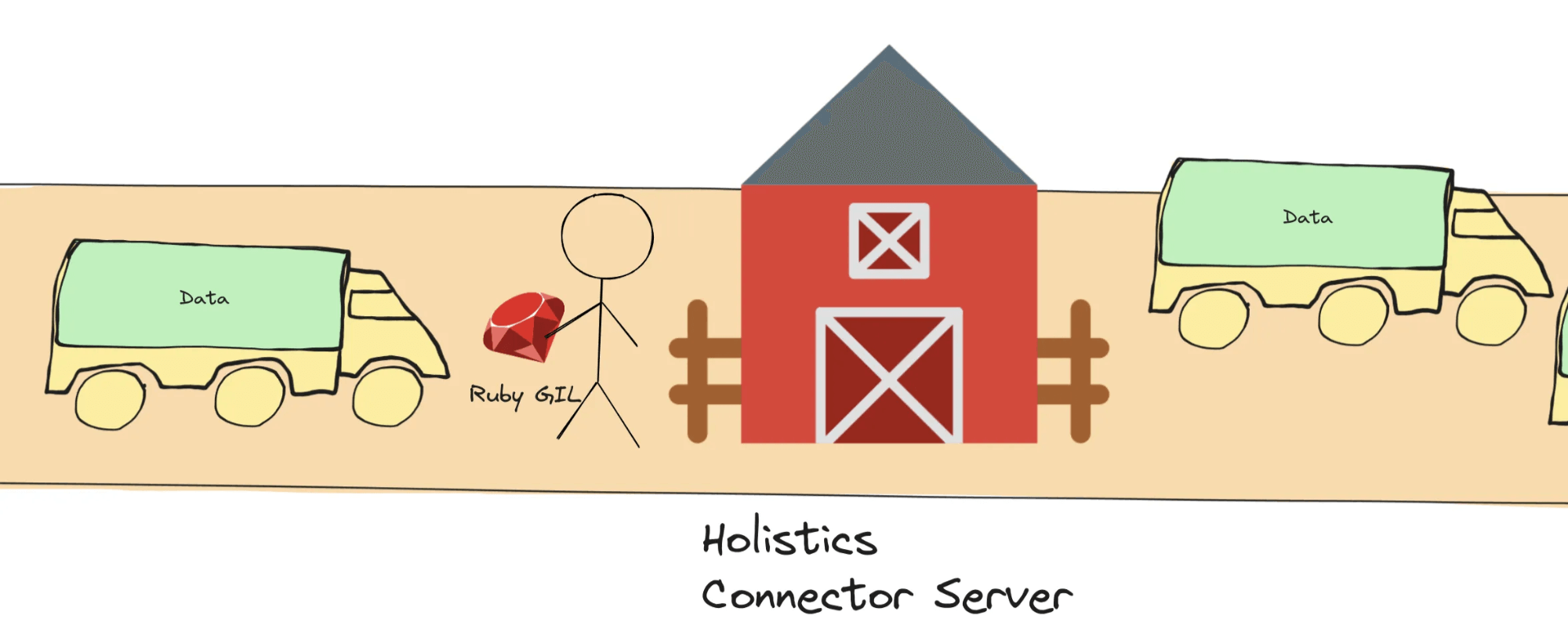 - The “worker” must hold the Ruby GIL to be permitted to unload data from the left “truck” into the “barn” and to load data into the right “truck”.