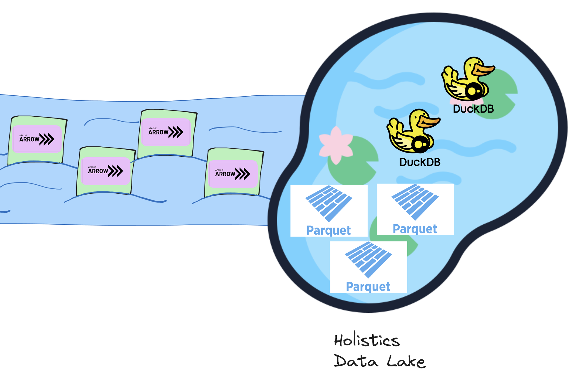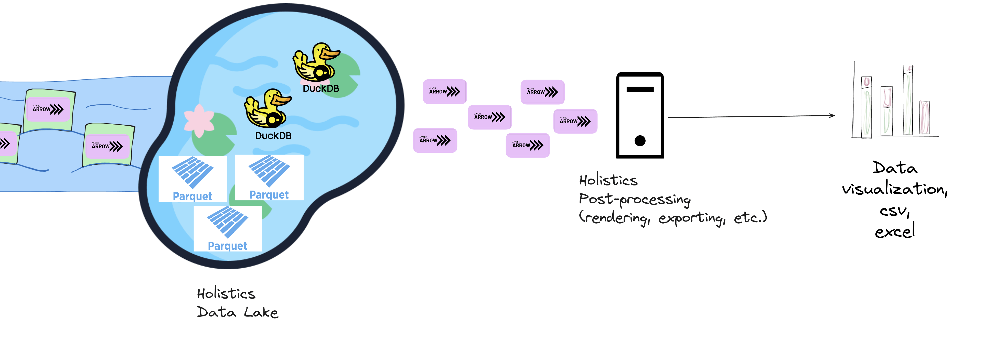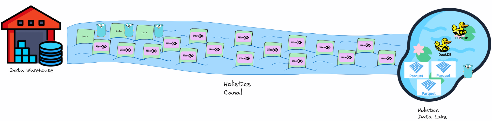 Holistics Canal uses Apache Arrow as the data format for transferring data into the Data Lake. It avoids the cost of “unloading” and “loading” data (i.e. serialization and deserialization) into and from the Data Lake.