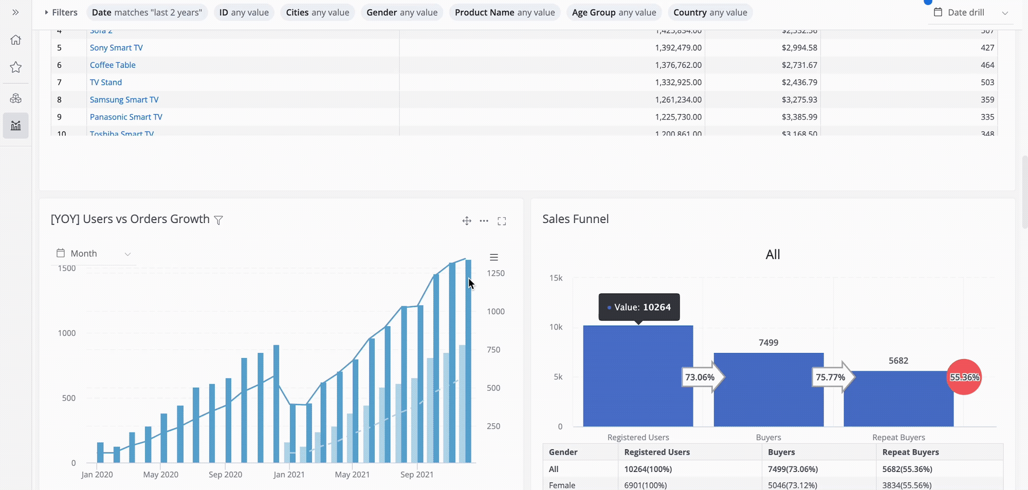 When it comes to the dashboard visualization layer both tools offer varied chart options like a bar, line, heatmap, etc. However, Holistics provides better-looking charts and even more visualization types by default than Looker. For instance, if you want to keep all your metrics in one sheet and visualize it with sparklines, it can be visualized using their metric sheet widget type easily.